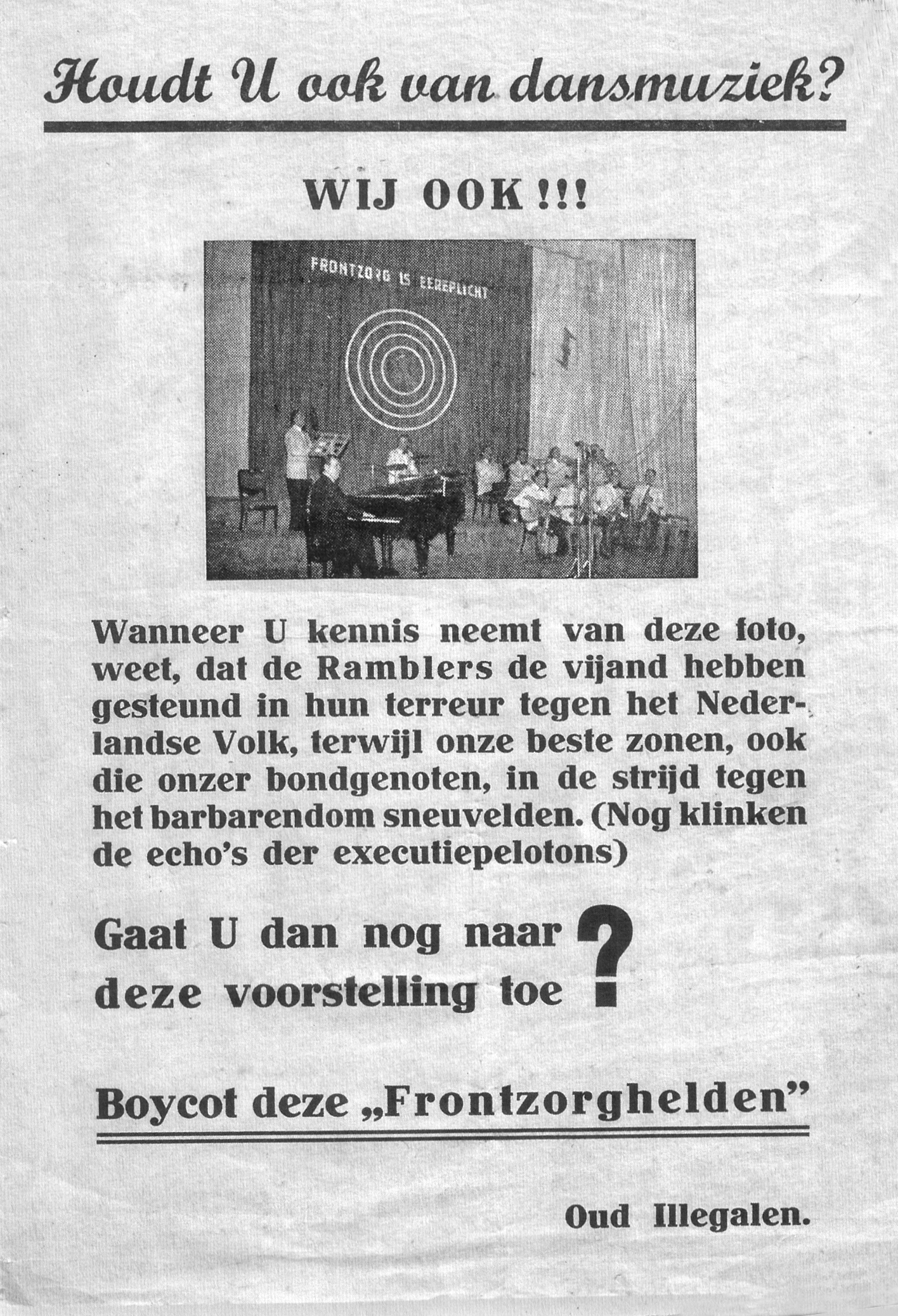 Toen het ‘Maa…rrr wij komen terug…’ in 1946 realiteit werd reageerde het publiek daarop verschillend. Een deel had de neiging het oorlogsverleden te laten rusten, maar anderen wilden de rol van de zuiveringsinstanties wel ‘spontaan’ overnemen. Dat ondervonden de Ramblers bijvoorbeeld bij hun optreden in Haarlem op 6 januari 1946, toen de rotte tomaten door de lucht vlogen.[22] Dick Verkijk herinnert zich hoe in die tijd foto’s van de Ramblers, ‘zittend onder een immense Duitse adelaar met hakenkruis’, aan potentiële bezoekers werden uitgereikt.[23] Zie de foto van het pamflet dat door oud-illegalen werd verspreid.