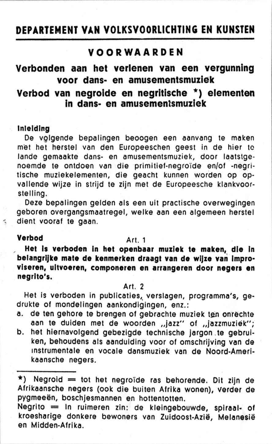 Brief 10 augustus 1943: ‘Naar mij uit perspublicaties en rapporten van mijn controleurs blijkt, geschiedt het optreden van Uw orkest niet volgens de door mij gegeven en U welbekende richtlijnen. […] Bovendien heb ik aanwijzingen gegeven betreffende het tegengaan van onbeschaafd applaus en van den negerstijl der dansmuziek, aan welke aanwijzingen evenwel niet de hand wordt gehouden, aangezien de rapporten nog steeds melding maken van onbeschaafde tafereelen. […] Nu […] door Uw orkest blijkbaar niets wordt ondernomen ter beteugeling van het ongewenschte element in de door U geproduceerde muziek en door U opmerkingen worden gemaakt welke niet geduld kunnen worden acht ik het tot mijn spijt noodzakelijk maatregelen te treffen, welke nakoming van de door mij gegeven voorschriften verzekeren. In verband hiermede draag ik U op: