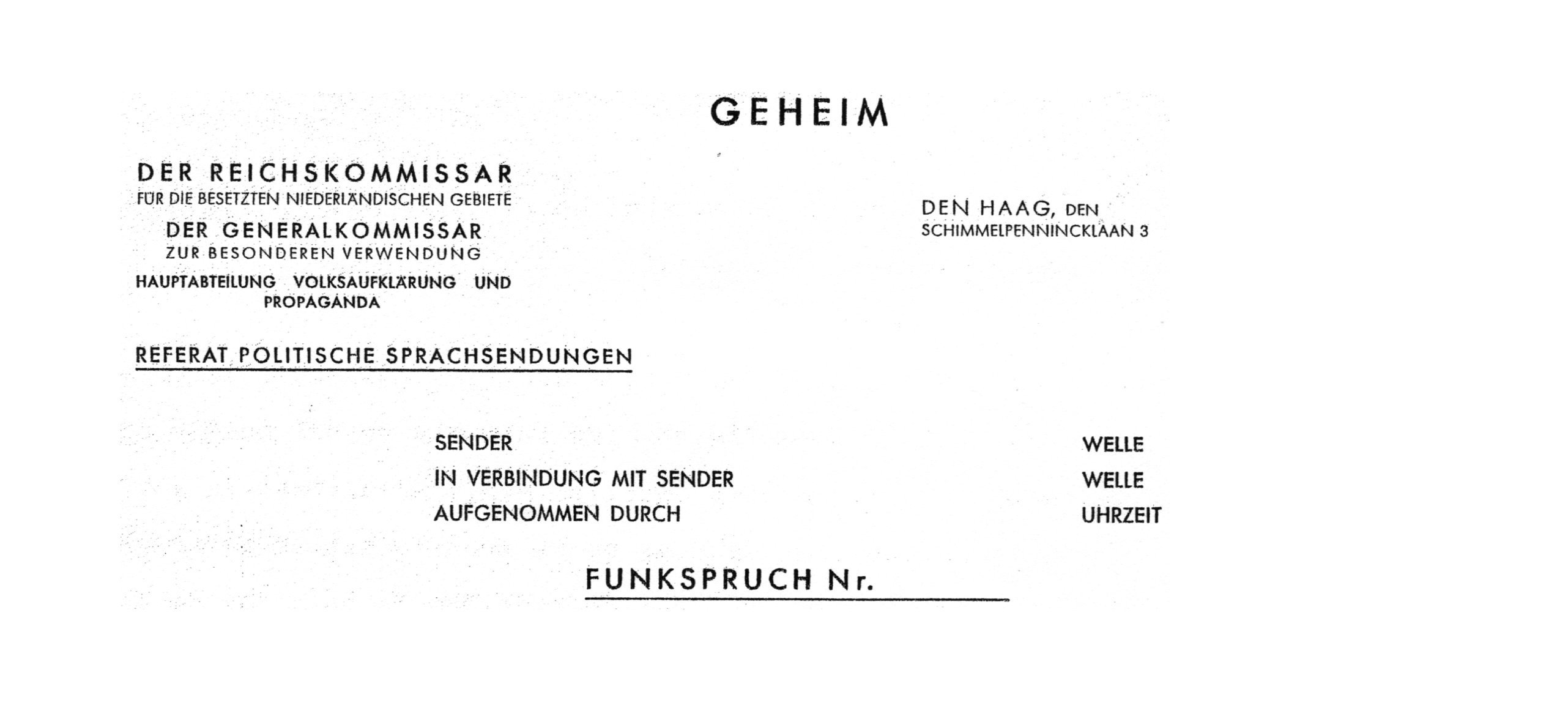 Aan het eind van een script las ik soms : ‘Stimme in Musik einblenden’ of ‘abblenden’. Kennelijk zat er een Duitser aan de knoppen. Alle Gil-programma’s werden van tevoren op platen opgenomen in de studio van Taubert, hoofd van de Rundfunkbetreuungsstelle. Tijdens een verhoor na de oorlog verklaarde een getuige dat soms gebruik werd gemaakt van ‘magnetoband’.[19] Aan de Gil-programma’s zouden ook leden van de Ramblers en het orkest van Frans Wouters hebben meegewerkt; ik heb teksten aangetroffen die daar op zouden kunnen wijzen. [20] Opmerkelijk is dat Waterman zijn scripts soms typte op de achterkant van briefpapier, bestemd voor het verzenden van geheime berichten en voorzien van het briefhoofd van DER REICHSKOMMISSAR, gevestigd aan de Schimmelpennincklaan 3 te Den Haag.